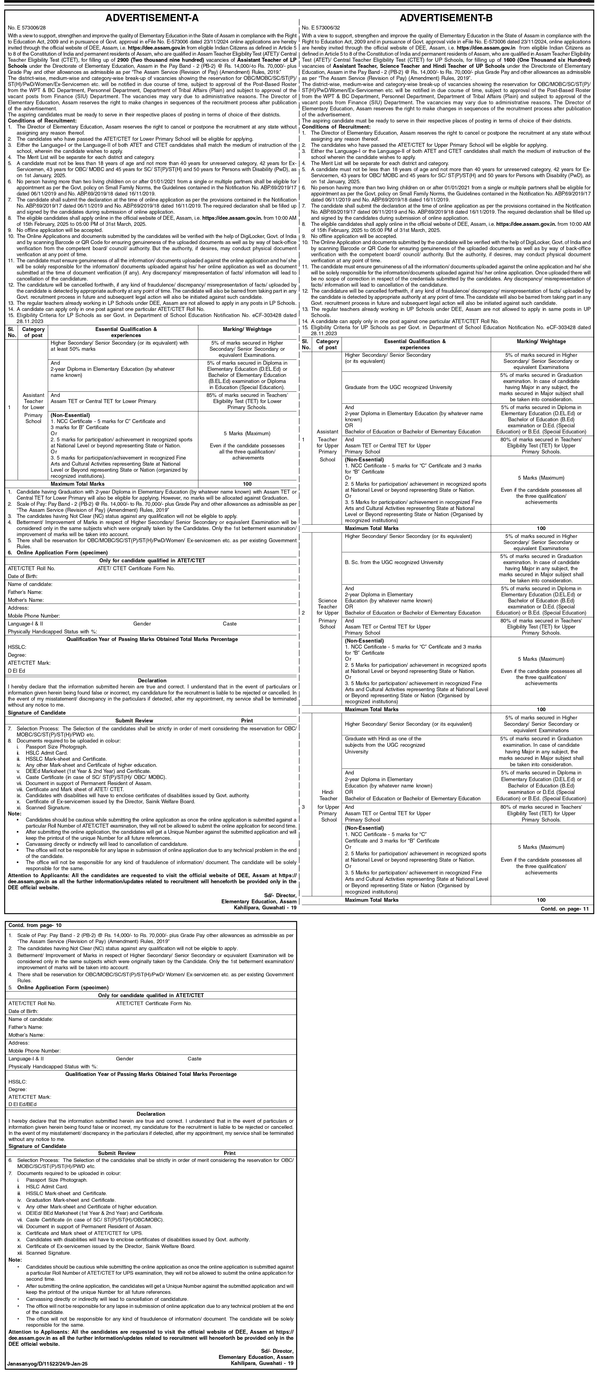 DEE Assam Notification 2025 for Assistant Teacher Posts: